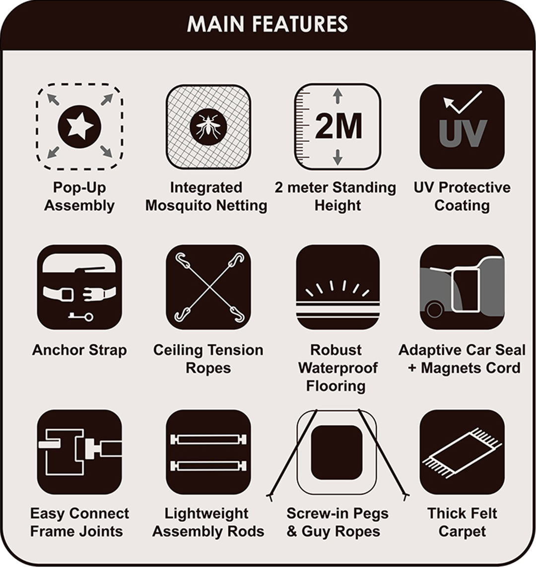 - Accessory Pack:Ceiling tension ropes*1(2 pcs)、Guy-ropes*4、Screw-in peg*4、Magnet cord*2