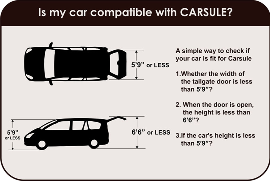 The CARSULE is designed for cars that have a tailgate that swings up. Many hatchbacks, minivans, MPVs, SUVs or station wagons have this kind of rear door. In its "up" orientation, the door serves as structural support for the CARSULE.