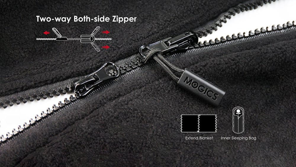 MOGICS Blanket uses a two-way double-sided zipper, which can be opened and closed from either side. It can be used as a cloak. It can also be easily adjusted with the inside zipper when you are curled up inside your sleeping bag.